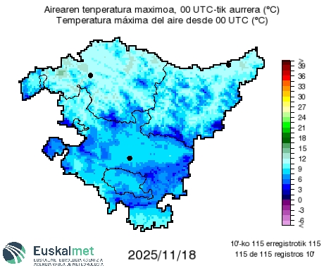 🌡#Tmax ✅Pittin bat jaitsi dira, hala ere, hegoaldeko haizearekin epeltasun puntuarekin jarraitzen dugu. 📉Mañana el viento cambiará a norte y la bajada será más notable, las máximas se quedarán por debajo de los 15 ºC en el interior y rondarán ese valor en la costa. https://t.co/vC0HtHW8Pv
