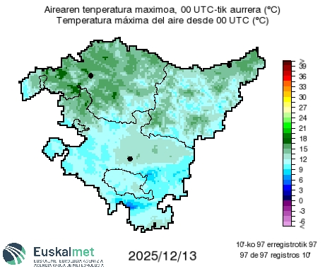 🌡#Tmax ✅Aldaketa handirik ez tenperatura maximoetan. Giroa argiagoa izan denez, mendebaldeko altuenak igo dira. ✅El domingo las temperaturas diurnas serán similares o un poco más bajas. Las mínimas no variarán y serán frías en puntos de la mitad sur. https://t.co/iJfFR2u0uO