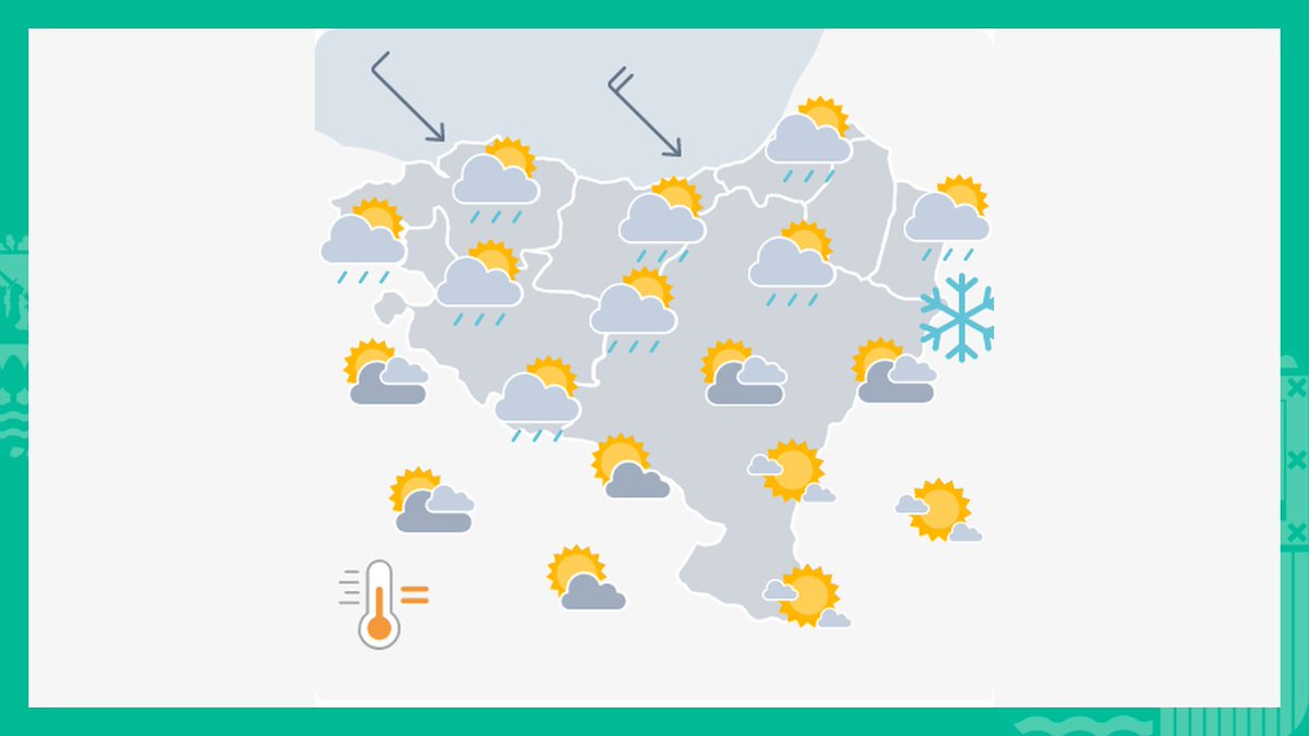 #EguraldiaHoy 🌦 Por la mañana nublado y lluvia débil, sobre todo en el oeste. Por la tarde nubes y claros y baja probabilidad de lluvia. ➡⬇ Por la mañana viento de componente oeste, por la tarde girará a norte. 🌡📉Tmáx 13-15 ºC. https://t.co/vLgGLSPOLK