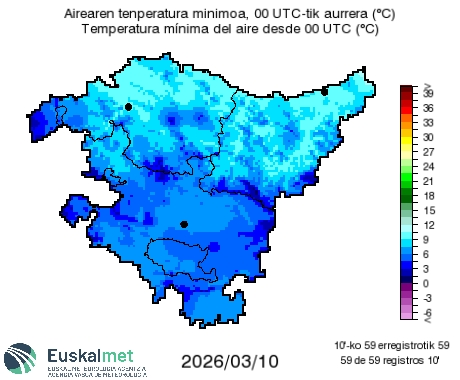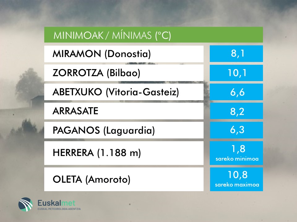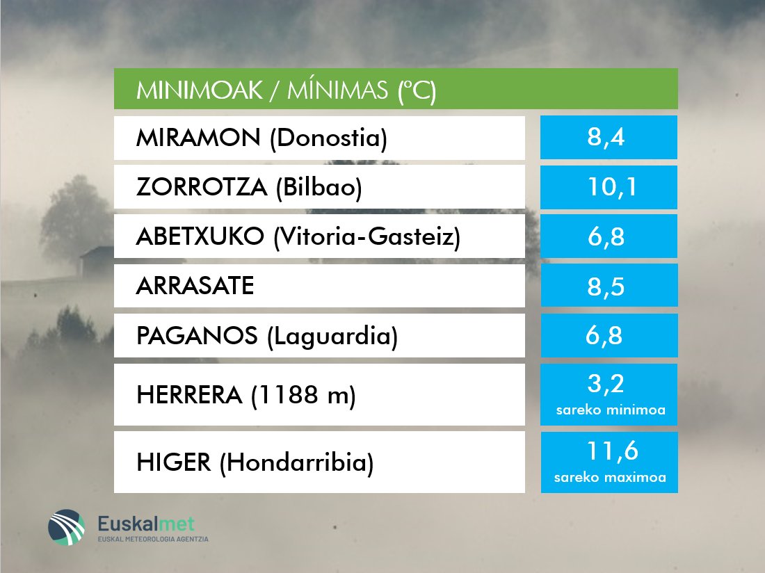 🌡#Tmin 📉Zenbait tokitan atzo baino giro hotzagoa izan dugu. ✅Mañana debido a la nubosidad y a la formación de nieblas serán similares. https://t.co/aZRS3BoPSt