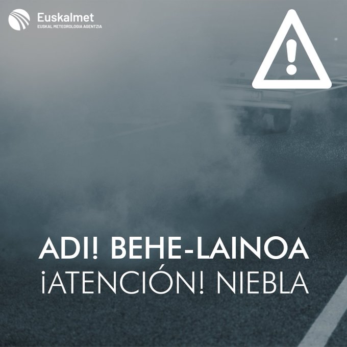 🌫 #Orain #Ahora #lainoa ⚠ Zenbait tokitan behe-laino itxia sortu da. ⚠ Se ha formado niebla cerrada en algunos lugares. https://t.co/VkUT1x1LoT